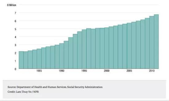 残疾申请也随失业率而上升和下降。例如,西弗吉尼亚州是唯一一个平民就业率低于一半的州(截至2015年),其失业率为5.2%,总劳动力参与率为53%(截至2017年),并且 - 意外,惊喜- 该州的残疾受益人比例最高,为8.9%的黄金年龄工人。然而,在夏威夷的热带天堂,该州2.8%的黄金年龄公民残疾率相当于2.1%的超低失业率。