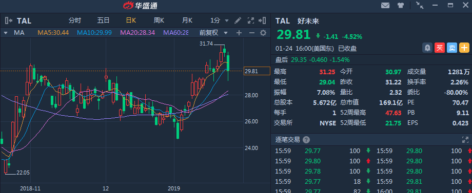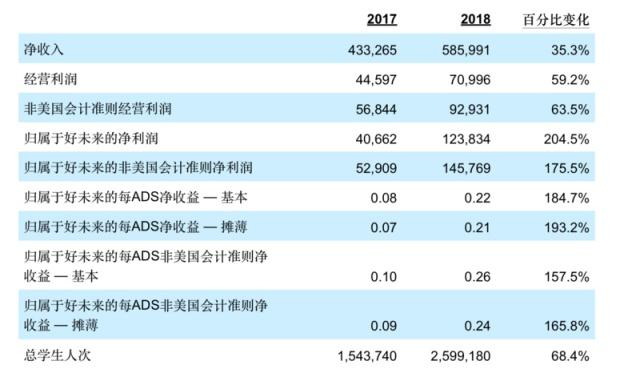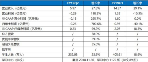 1月24日,好未来公布了截至2018年11月30日的2019财年第三季度财务报告。财报显示,好未来Q3净收入为5.860亿美元,同比增长35.3%,超出市场预期;净利润为1.238亿美元,同比大幅增长204.5%。收入的主要来源为学生人数的增加,在小班及线上课程的带动下,总学生人数增长至2599180人,同比增长68.4%。公司Q4收入指引为6.7亿到6.856亿美元,同比增长33%到36%。