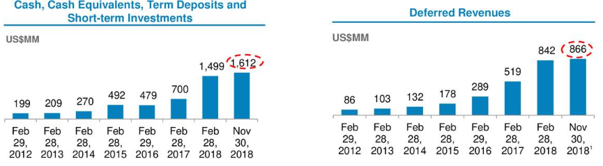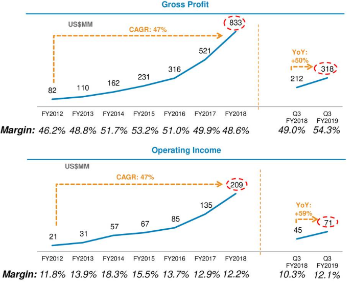 公司2019财年Q3毛利润为3.18亿美元,同比增长50%,毛利率为54.3%,较同期增长5.3个百分点;营业利润为7100万美元,同比增长59%,营业利润率为12.1%,较同期增长1.8个百分点。自上市以来,公司保持高速增长,毛利润、营业利润年复合增速达到47%。