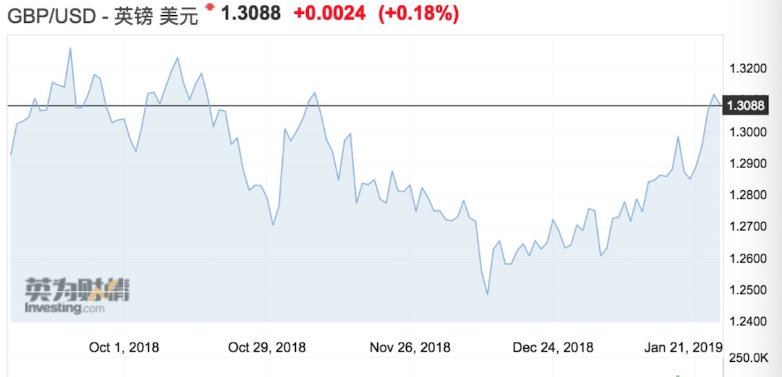 截至北京时间1月25日16:00,英镑/美元报1.3092,升至11月周高位。此前英国太阳报报导,北爱尔兰民主联盟党(DUP)私下同意,下周将有条件支持首相特雷莎梅的退欧协议。英镑本周迄今已攀升约1.8%,兑美元升至关键的心理水准1.30上方,因市场期望英国可能避免在3月29日无协议退欧。不过,一切都尚无定数。
