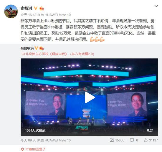 但实际上,俞老师不但不会打他们,还要重重地奖励他们。1月25日上午,俞敏洪先是转发了视频,下午又发微博表示: