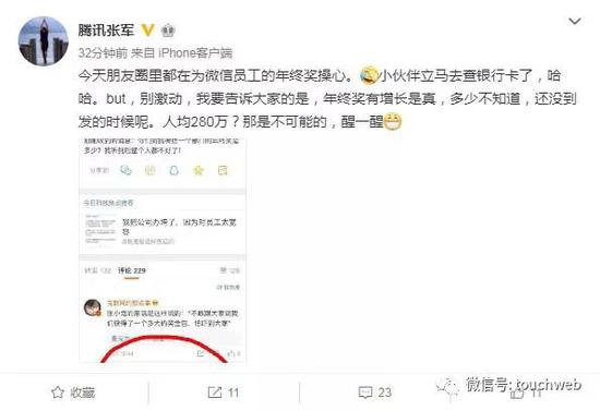 对此,腾讯公关总监张军表示,今天朋友圈里都在为微信员工的年终奖操心。小伙伴立马去查银行卡了,哈哈。
