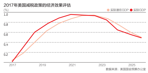 事实上,依据CBO 的预测,2017年减税对十年内的真实GDP和真实的潜在GDP增长都构成正面支撑,2023年减税的效果将得到最大的发挥,使真实GDP和真实的潜在GDP增长都上升大约1个百分点。减税效果的最终消失则要在10年之后,主要的原因是减税会带来联邦政府赤字的继续攀高,最终带来挤出效应。