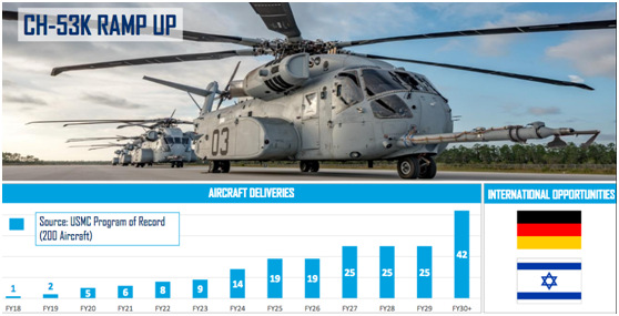 接下来的几年里,公司的CH-53K超大型直升机将进入密集交付期。该款直升机是“世界上首屈一指的重型直升机”,生产成本达到1.4亿美元,单价比1.1亿美元的中国歼20以及1.22亿美元的美国F35战斗机还要高,目前已经进入美国海军陆战队服役。