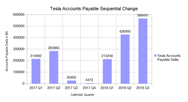 就量产提效而言,公司还并未实现量产提效的实际效果。Q2到Q3,尽管Model 3平均价有小降,但每辆车平均生产成本却环比提升33%,与量产成本下滑理论相悖。Q3的确录得盈利,不过远低于笔者预期,实际上超预期盈利来自积分补贴的推动,从公司资产与负债下的“应收账款”中可发现问题,应付账款为公司记录了公司未被纳入开支的消费情况,比如哦购买设备费用,如下图,每季度数字为环比增长额。