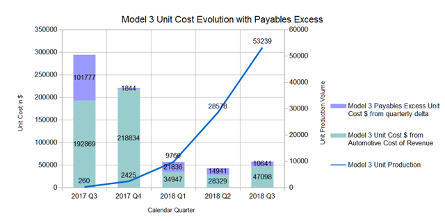 2.若把17年Q3以来的应收增量算入Model 3单元营收成本,则可以得到总单元成本及季度产量数据,如下图,数据显示Model3单元成本从Q2的43270元提至Q3的57739美元,环比增速33.4%。不管将所有应收增量算入Model 3成本是否合理,Model 3成本随时间提升的一致性趋势至少可以得出。按以上预计,基于55837美元的平均售价,Model 3 Q3单元毛利率实际上为负(-3.4%),远低于财报实际的19.9%。