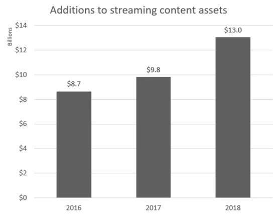 Netflix的商业模式通常意味着苹果需要大量的现金流,因为平台不仅需要花费大量资金生产原创电影和电视节目上,同时也需要积极获取第三方内容,因为只有这样才能为消费者提供更多选择,让平台对用户更有吸引力。例如,2018年Netflix在内容上投入了130亿美元,并预计2019年将增加到150亿美元。
