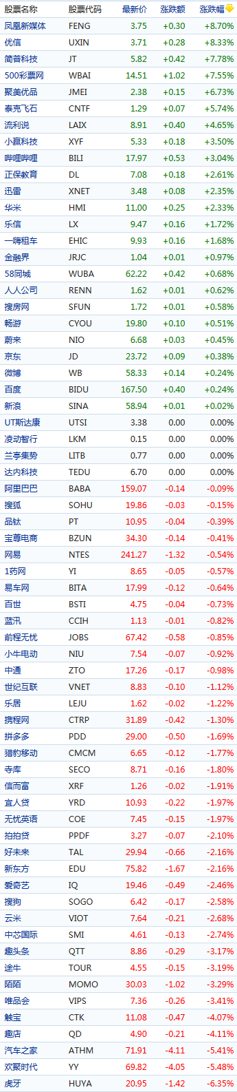 中概股周一涨跌不一,其中5支股票涨幅超过5%,凤凰新媒体涨8.70%报3.75美元,优信涨8.33%报3.71美元,简普科技涨7.78%报5.82美元,500彩票网涨7.55%报14.51美元,哔哩哔哩涨3.04%报17.97美元。