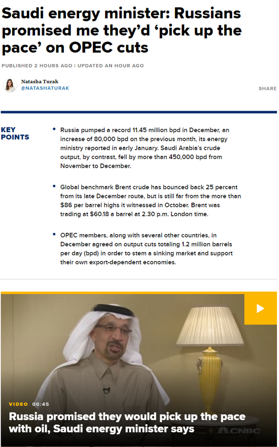 俄罗斯最初让沙特承担了减产的大部分责任。作为欧佩克的头号成员,沙特经常表示,每桶60美元足以满足其经济需求。俄罗斯去年12月表示,将在明年1月将日产量削减5万至6万桶,而据报道,沙特承诺将日产量较去年11月的水平削减90万桶。