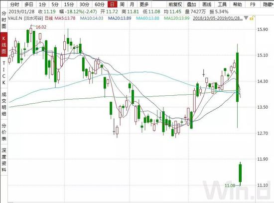 受决堤消息影响,在美国上市的淡水河谷股价1月25日大跌8.1%,周末休市两天,28日美股收盘,淡水河谷暴跌逾18%。