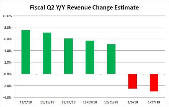 衡量苹果进步的最大指标将是业绩指引。正如你在下面的图表中看到的,预期有所下降,但华尔街预计第二季度的收入降幅不会像第一季度那么大。这在一定程度上可能取决于苹果何时发布新产品。我们会看到iPhone SE的更新,还是会像往年一样,在3月底看到iPad的更新?我不认为这家公司会为了短期的收益而匆忙将AirPower、AirPods 2或流媒体服务推向市场。