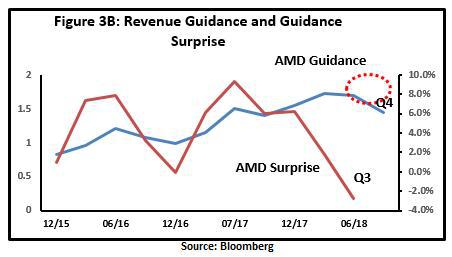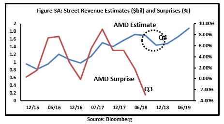 由于最近的股票价格主要受到收入指引的推动,因此AMD在2019年第一季度的收入指引对此特别感兴趣。也许是由于加密活动的减少,AMD的第四季度收入预测和指导意外都出现了下降趋势(图3A和图3B)。然而,考虑到加密效应在第四季度可以忽略不计,华尔街对第一季度收入约14.8亿美元的估计似乎是乐观的,因为最近上线的一系列下行指引。