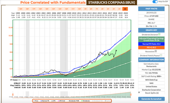 多年来,SBUX的利润实现了两位数的强劲增长。自大萧条以来,2017年是SBUX每股收益唯一没有增长至少14%的一年。我担心每股收益也有下降的趋势,但2018年的每股收益却逆势增长了17%。展望未来,分析师预计两位数的每股收益增长趋势将持续下去,2019年为12%,2020年为11%,2021年为13%。
