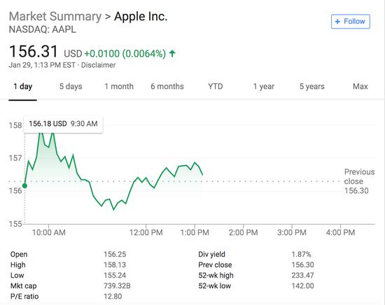 周二截止发稿,苹果公司股价上涨0.01美元,至156.31美元。