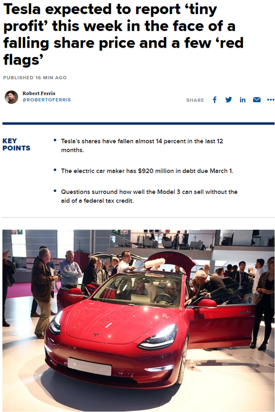 在投资者等待特斯拉周三收盘后公布第四季度业绩之际,股价下跌、电动汽车补贴到期以及约五周后堆积如山的债务等问题正笼罩着特斯拉。他们将观察今年最后三个月的业绩与第三季度的强劲业绩相比如何。第三季度的强劲业绩给投资者带来了意外的利润、好于预期的汽车销售和更快的Model 3运动型轿车生产。