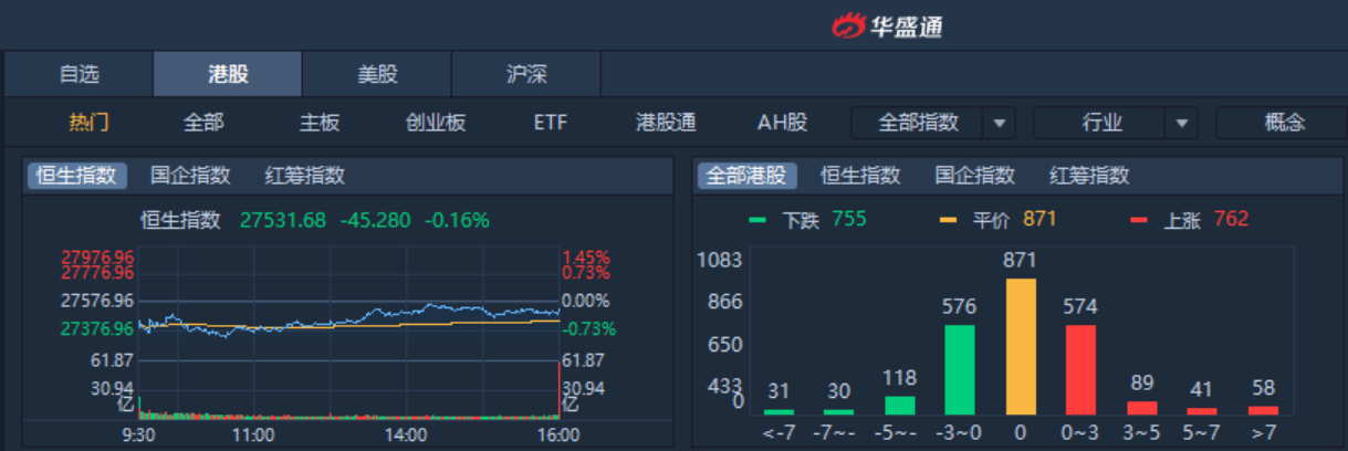 周二恒指早盘低开,午后跌幅逐渐收窄,最终收跌45.28点,跌幅0.16%,报27531.68点,全日成交额919.33亿。国企指数跌0.14%,报10867.42点,红筹指数跌0.36%,报4323.18点。