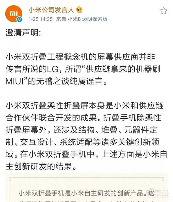 1月25日,小米发表官方澄清声明称:“小米双折叠工程概念机的屏幕供应商并非传言所说的LG,所谓“供应链拿来的机器刷MIUI”的无稽之谈纯属谣言。小米双折叠手机是小米自主研发的创新产品。这款手机的柔性折叠屏本身是小米和供应链合作伙伴联合开发的成果。折叠手机小米不是第一家,但能够做到双折叠小米的确是行业首家。”