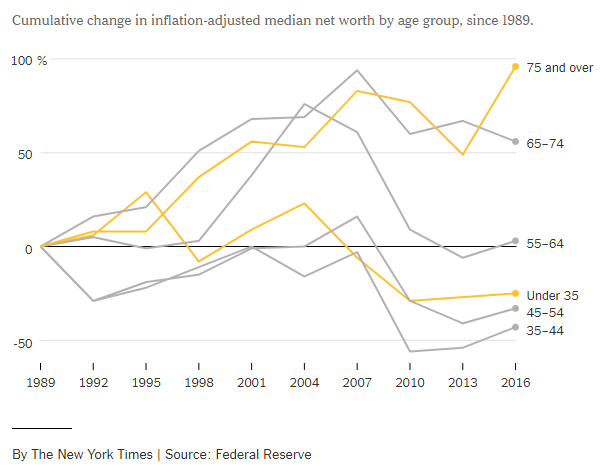 扣除通胀影响后美国各年龄段财富积累变化趋势(来自《纽约时报》)