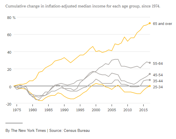 扣除通胀影响后美国各年龄段收入变化趋势(来自《纽约时报》)