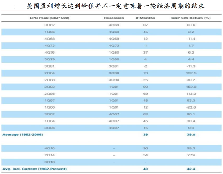 最后一个让投资者担心的问题是,随着美国经济增速放缓,市场无法进一步反弹。尽管,美国国内生产总值增长率存在着下降的可能性,但仍有可能保持在2%的范围内。从历史上来看,美国盈利增长达到峰值并不一定意味着一轮经济周期马上结束。平均来看,美国盈利增长峰值出现的时点举例经济衰退的时点大约超过3年,标普500指数在这段时间内的平均回报率约为40%。