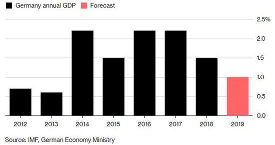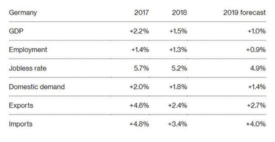 德国经济部表示,欧洲最大的经济体将2019年经济增速预期从1.8%下调至1.0%。尽管如此,连续10年的扩张将使失业率下降至创纪录的低点4.9%,预计2019年薪资增速为4.8%,就业将升至4520万。