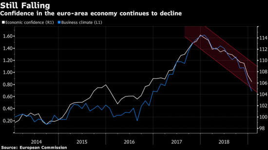 日内公布的数据显示,欧元区经济景气指数下降幅度超过经济学家此前的预测,达到两年多以来的最低水平。悲观情绪在工业、服务业和零售业中蔓延,而消费者的情绪略有改善。