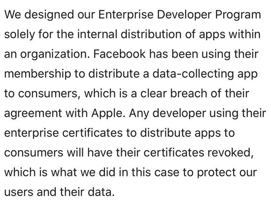 “任何使用企业证书向消费者发布应用程序的开发者,其证书都将被吊销以保护我们的用户及其数据,我们在本例中就是这么做的。”