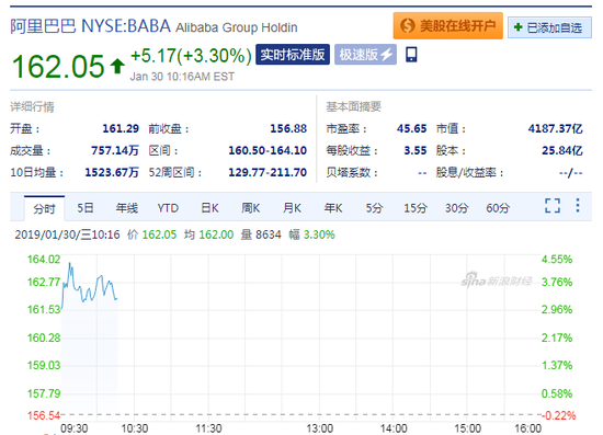 北京时间1月30日晚,阿里巴巴集团公布2019财年第三季度业绩,受此影响,阿里巴巴(NYSE:BABA)一度涨超4%,截至发稿,涨幅缩窄至3.30%。财报显示,集团收入同比增长41%达1172.78亿元。这是中国首个互联网公司实现单季营收破千亿,彰显出中国社会强大的消费信心以及阿里巴巴强劲的“平台效应”。