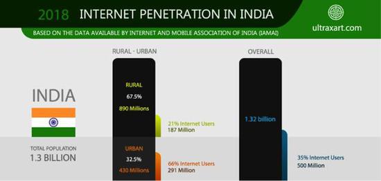 除了整体增长之外,印度2013年至2017 年的电子商务年复合增长率为53%,是全球增长最快的电子商务市场,预计到2022年的年增长率预计为35%。尽管电子商务销售在过去5年中增长非常迅速,但他们的在线零售渗透率却相当低,只有5%。在线零售渗透率低的一个重要原因仅仅是因为印度的互联网可访问性相对较低: