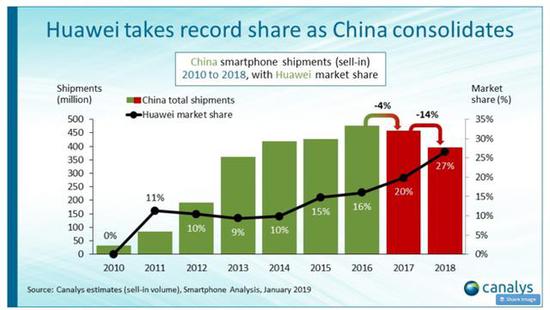 如下图所示,一些与中国市场相关的研究也记录了智能手机出货量在收益前下降的情况。同一项研究强调了华为不断增长的市场份额。