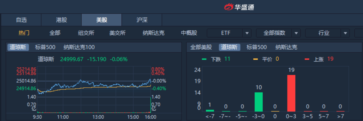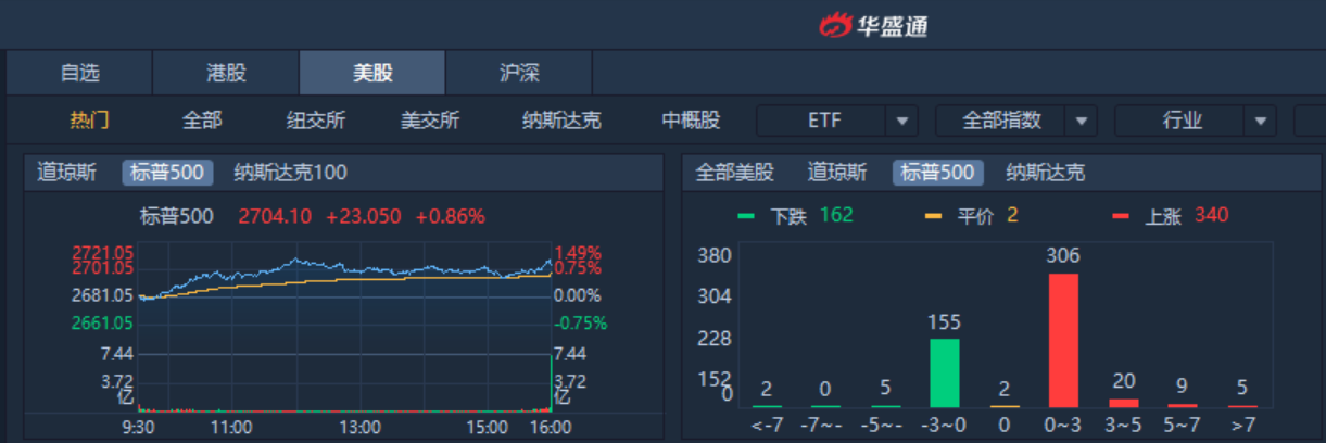 周四,美联储宣布暂不加息,美股三大指数涨跌不一,道指微跌0.06%,报24999.67点;标普500上涨0.86%,报2704.10点;纳指上涨1.37%,报7281.74点。