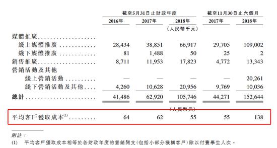 问题出在营销开支上,根据最新财务数据,新东方在线2018年6-11月的营销开支同比猛增244.79%至,直接导致新东方在线的平均客户获取成本由2018财年的55元增长1.51倍至最新的138元!