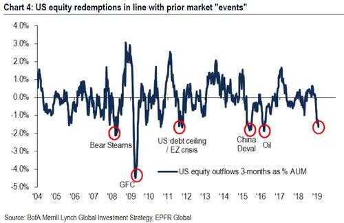 此外,正如美国银行(Bank of America)的迈克尔-哈特尼特(Michael Hartnett)指出的那样,过去11周中,不仅有10周出现资金流出,美国股票基金流出了数十亿美元,ETF流出121亿美元,共同基金流出29亿美元,而且在过去3个月中,美国股市遭遇了创纪录的资金外流,总计820亿美元,相当于全部资产管理规模的2%,与过去10年美国股市在“重大事件”和“重大低点”时的悲观情绪一致。
