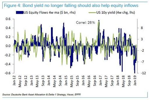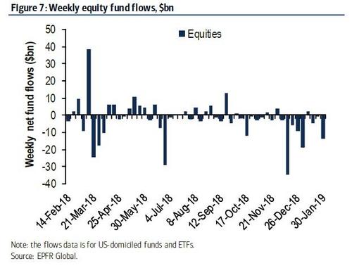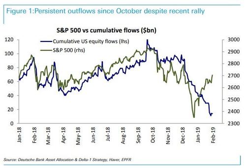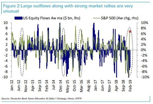 虽然还不知道真正的答案,但购买股票的到底是谁这个问题不只让华尔街感到困惑。正如德意志银行的帕拉格-塔特(Parag Thatte)在他最新的每周资金流动报告中所写的那样,尽管标准普尔500指数自去年12月底以来上涨了15%,但股票基金继续出现大规模资金外流。“在10月至12月的抛售期间出现大规模资金流出(770亿美元)之后,美国股票基金继续出现大规模资金流出(400亿美元)。”