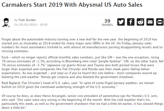 福特是唯一的例外,它的月度销量增长7%,而此前的预期为-1.5%。另一方面,通用汽车下跌7%,低于此前预计的-3.7%。日本汽车巨头日产和丰田也公布了高于预期的亏损,菲亚特-克莱斯勒和本田等公司的温和增长也低于预期。正如所预料的那样,大多数公司最终都把问题归咎于寒冷的天气。本田还指责美国政府关门。