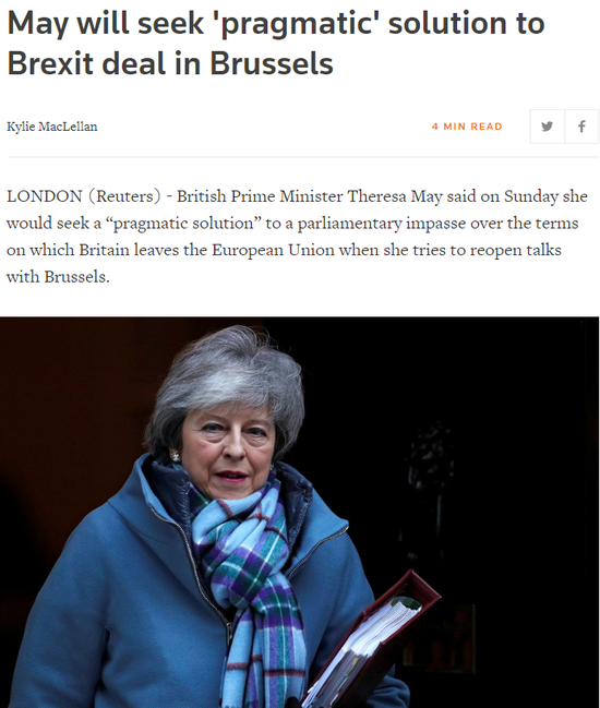 上月拒绝了梅与欧盟达成的退欧协议的英国议会议员已指示她返回布鲁塞尔,就北爱尔兰的安排重新进行谈判。梅表示,“当我回到布鲁塞尔时,我将为英国和北爱尔兰而战,我将带着新的使命、新的想法和新的决心,就一项务实的解决方案达成一致,实现英国人民投票支持的脱欧。”