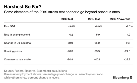 2019年的考核将假设美国失业率出现压力测试史上最大跃升 —— 上升超过6个百分点,至10%。10年期国债的收益率也将随着商业房地产和住房价格下跌。