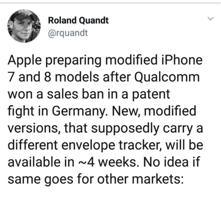 知名爆料人Roland Quandt透露近日透露,为了绕过Qorvo芯片的节电专利,苹果有意在德国重新制造全新型号的iPhone 7及iPhone 8,而新型号将采用全新的包络追踪模块。