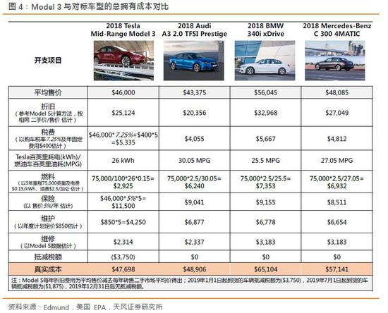 我们根据Edmund数据计算Model 3及主要对标车型的5年总拥有成本(TCO),包括奥迪A3、宝马3系和奔驰C级。鉴于Model 3数据还未在Edmund披露,我们的计算参照Model S计算方式,百公里耗电量参考美国EPA混合工况数据,对标车型数据均直接引用Edmund,均假设全款支付购车。