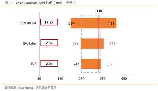 整体来说,我们对于Tesla在追逐电动汽车、智能驾驶和共享经济的愿景给予充分包容。Tesla在电池管理系统BMS方面的优势仍然业界领先,不过随着全球动力电池技术的进步,Tesla在电池能量密度、百公里耗电、电池成本等方面的优势也在逐渐缩窄。近日以2.18亿美元换股方式收购电池技术公司Maxwell,也希望通过Maxwell在超级电容器和干电极方面的技术专利,进一步巩固电池技术的护城河。我们根据Football Field估值方法测算目标价下调至330美元,维持“持有”评级。