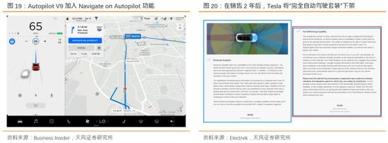 虽然Tesla正积极开发新一代Autopilot硬件和自主研发的车载芯片,但我们认为Tesla自主芯片仍待工程验证。Autopilot 9.0版本近日逐步发给车主进行更新,作为与Mobileye合作终止后最大更新的版本,V9将加入“Navigate on Autopilot”功能,实现高速公路路线导航规划与车道变更等操作,进一步向L3级别完善。(对比Mobileye在14年发布的EyeQ3中已经搭载全局路径规划功能、并在18年的EyeQ4中结合REM高精地图,加入下一代车道探测、驾驶策略系统、360度环境车辆探测等功能)