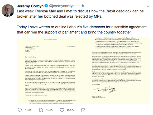 本周三, Corbyn发布致特雷莎·梅的公开信,称如果满足工党有关脱欧的5项要求,那么作为交换她将能获得工党的支持。他呼吁政府重新制定政治宣言;如果梅不改变谈判红线,那么工党不认为仅仅修改现有后备协议条款是可信或足够的。
