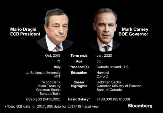 卡尼和德拉吉都是从学术界起步,然后任职于高盛和财政部门,分别升到加拿大和意大利央行行长之位,并最终成为英国央行和欧洲央行行长。他们都做过金融危机后成立的金融稳定委员会主席,旨在帮助国际银行监管。