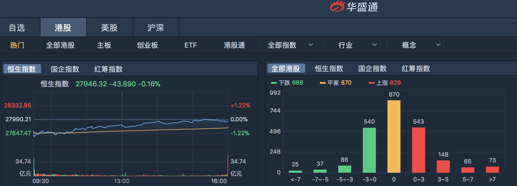 2月8日猪年首个交易日,香港恒生指数收跌0.16%,报27946.32点,早盘曾一度跌超1.6%。大市成交812.75亿港元,国指跌0.72%,报10956.58点,成交248.91亿港元。