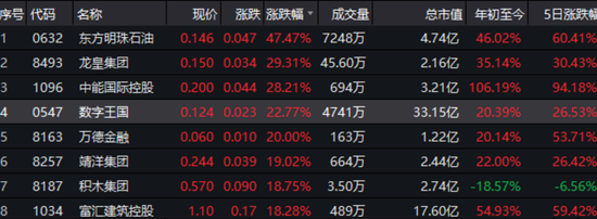 新浪港股讯 2月11日消息,东方明珠石油(00632)现价升45.46%,报0.144元,暂为升幅最大个股,突破250天线(0.133元),创去年8月中以来新高。此外,龙皇集团涨近30%,中能国际控股涨28%,数字王国涨23%,积木集团涨19%,万德金融涨20%。