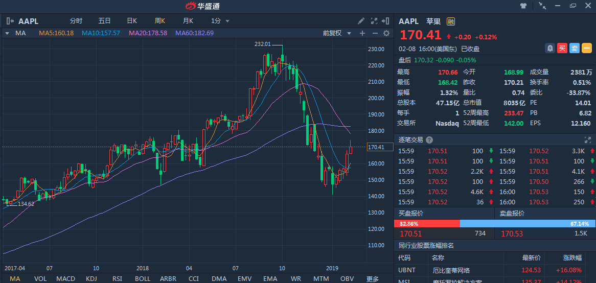 18年末的最后一周,周二苹果公司(AAPL)公布19年一季度财报,因业绩基本符合市场预期,减缓了此前的市场担忧,盘后股价大涨近6%,当日涨达6.89%,随后一路反弹至170美元。
