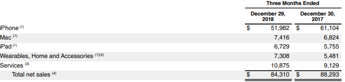 Q1营收为843亿美元,同比下滑5%,不过优于市场预期839.7亿美元。季度摊薄EPS 4.18美元,比市场预期的4.17美元高出0.01美元;按分部,最主要的iPhone营收录得519.8亿美元,同比大降15%,低于市场预期526.7亿美元;其次服务业务营收录得109亿美元,同比大涨19%,高于市场预期108.7亿美元。