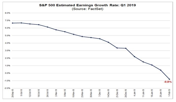 FactSet机构在2月初的一份研报显示,由于美国企业对未来的前景指引大幅下调,华尔街分析师也快速下调了对2019年一季度的盈利预期。今年一季度的平均盈利增速为负0.8%,或是2016年二季度以来(即近三年来)首次录得单季盈利同比不增反降。