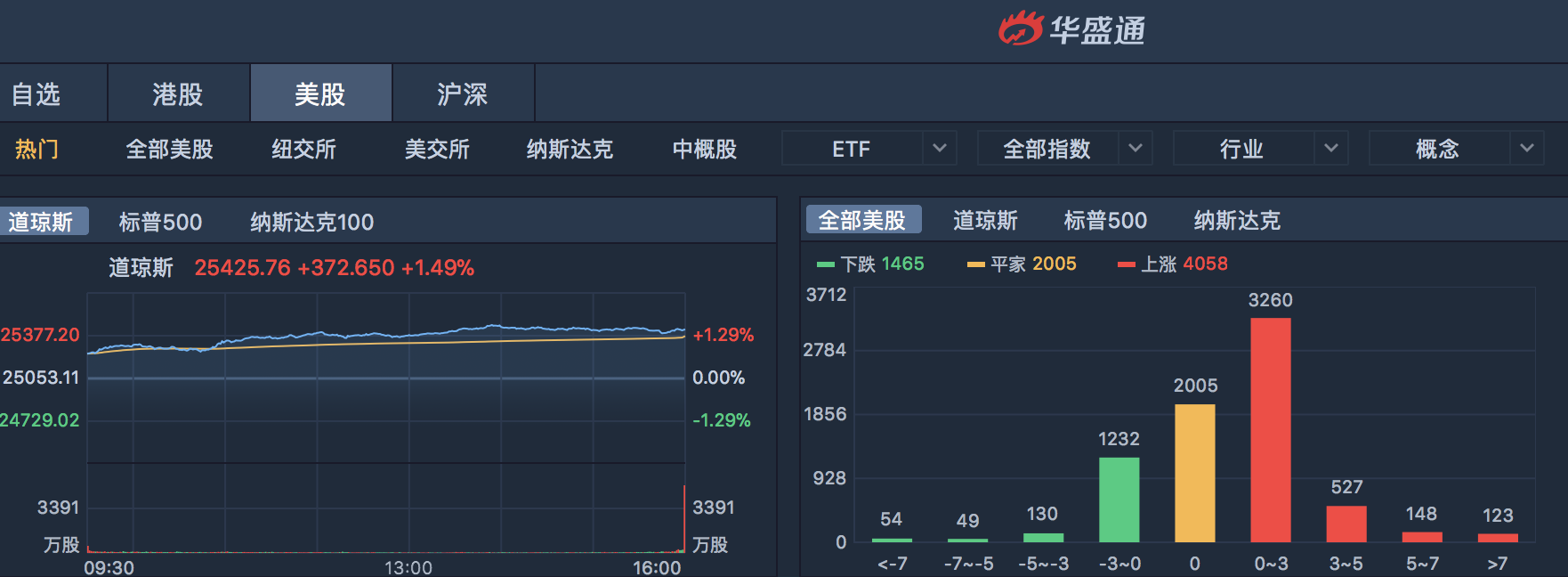 美国政府有望避免再次关门,令市场情绪乐观。道指涨1.49%报25425.76点,标普500涨1.29%报2744.73点,纳指涨1.46%报7414.62点。