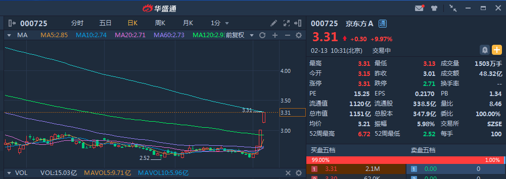 今日开盘,京东方成交量持续放大,多空经过一番较量后,股价再次涨停,成交额接近50亿元,居两市首位。